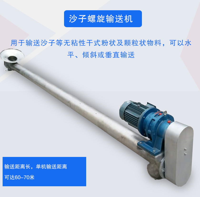 沙子螺旋輸送機(jī)適用于建材、化工、電力、冶金、煤炭、糧食等行業(yè),適用于水平或傾斜輸送粉狀、粒狀和小塊狀物料,如煤、灰、渣、水泥、糧食等,物料溫度小于200℃。