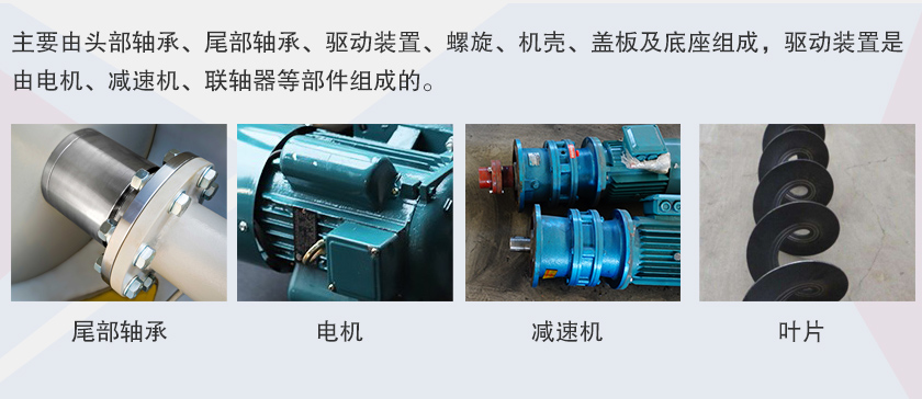沙子螺旋輸送機(jī)主要由頭部軸承、尾部軸承、驅(qū)動(dòng)裝置、螺旋、機(jī)殼、蓋板及底座組成,驅(qū)動(dòng)裝置是由電機(jī)、減速機(jī)、聯(lián)軸器等部件組成的。