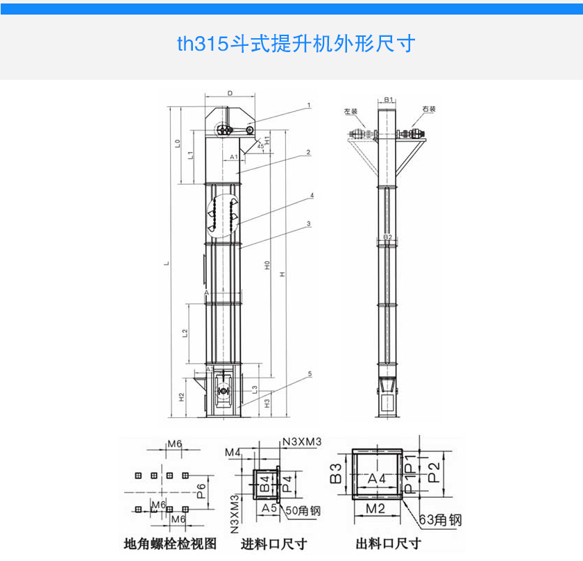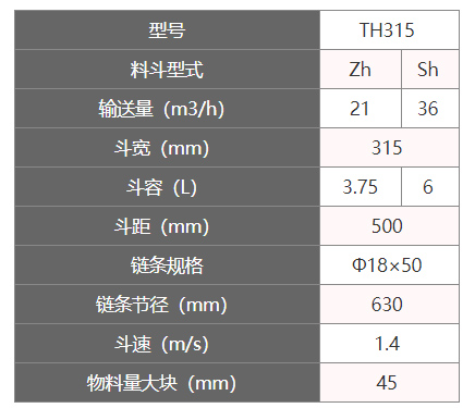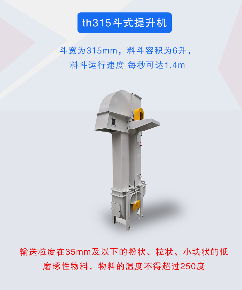 th315斗式提升機斗寬為315mm,料斗容積為6升,斗速1.4米/秒,適合輸送粉末狀,顆粒狀及小塊狀物料,th315斗式提升機輸送量為60立方/時,可選用碳鋼或不銹鋼材質.