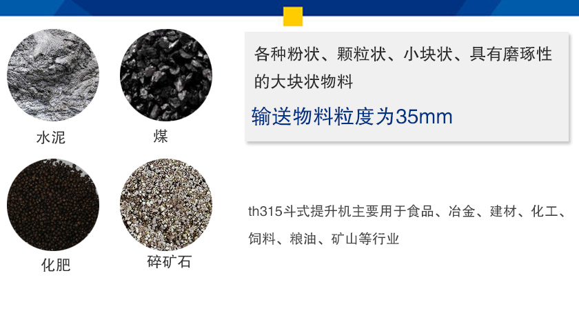 th315斗式提升機主要用于食品、冶金、建材、化工、飼料、糧油、礦山等行業(yè)中各種粉狀、顆粒狀、小塊狀、具有磨琢性的大塊狀物料,輸送物料粒度為35mm,如水泥、化肥、碎礦石等。