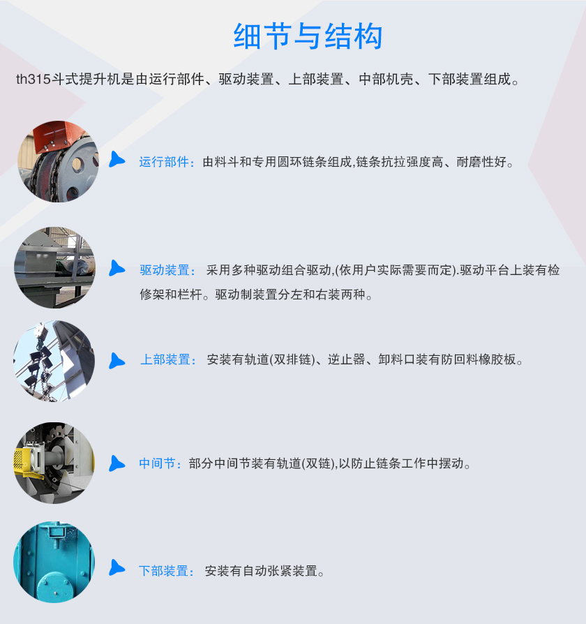 th315斗式提升機是由運行部件、驅動裝置、上部裝置、中部機殼、下部裝置組成。