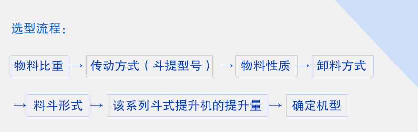 物料比重→傳動方式(斗提型號)→物料性質→卸料方式→料斗形式→該系列斗式提升機的提升量→確定機型。