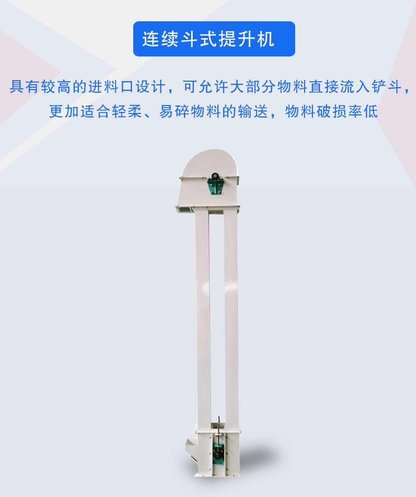 連續(xù)斗式提升機(jī)簡稱連續(xù)式提升機(jī),是利用料斗和牽引件進(jìn)行物料輸送的設(shè)備,連續(xù)斗式提升機(jī)采用比較慢的速度運行,具有較高的進(jìn)料口設(shè)計,可允許大部分物料直接流入鏟斗,更加適合輕柔、易碎物料的輸送,物料破損率低,對于較大和較重的塊狀物和高磨蝕性材料也是理想的選擇,根據(jù)牽引件的不同主要分為鏈條式和皮帶式兩種。