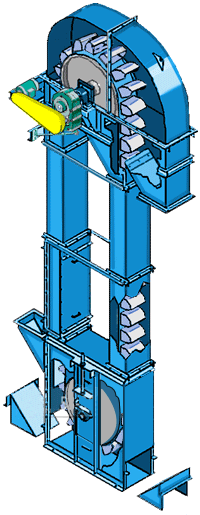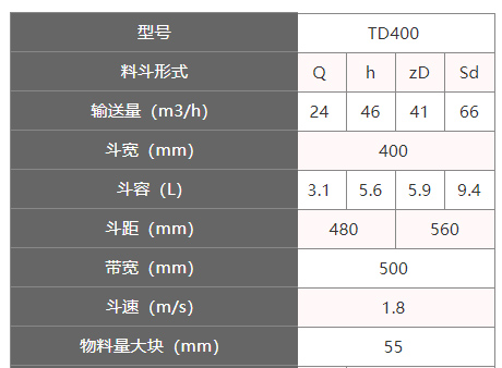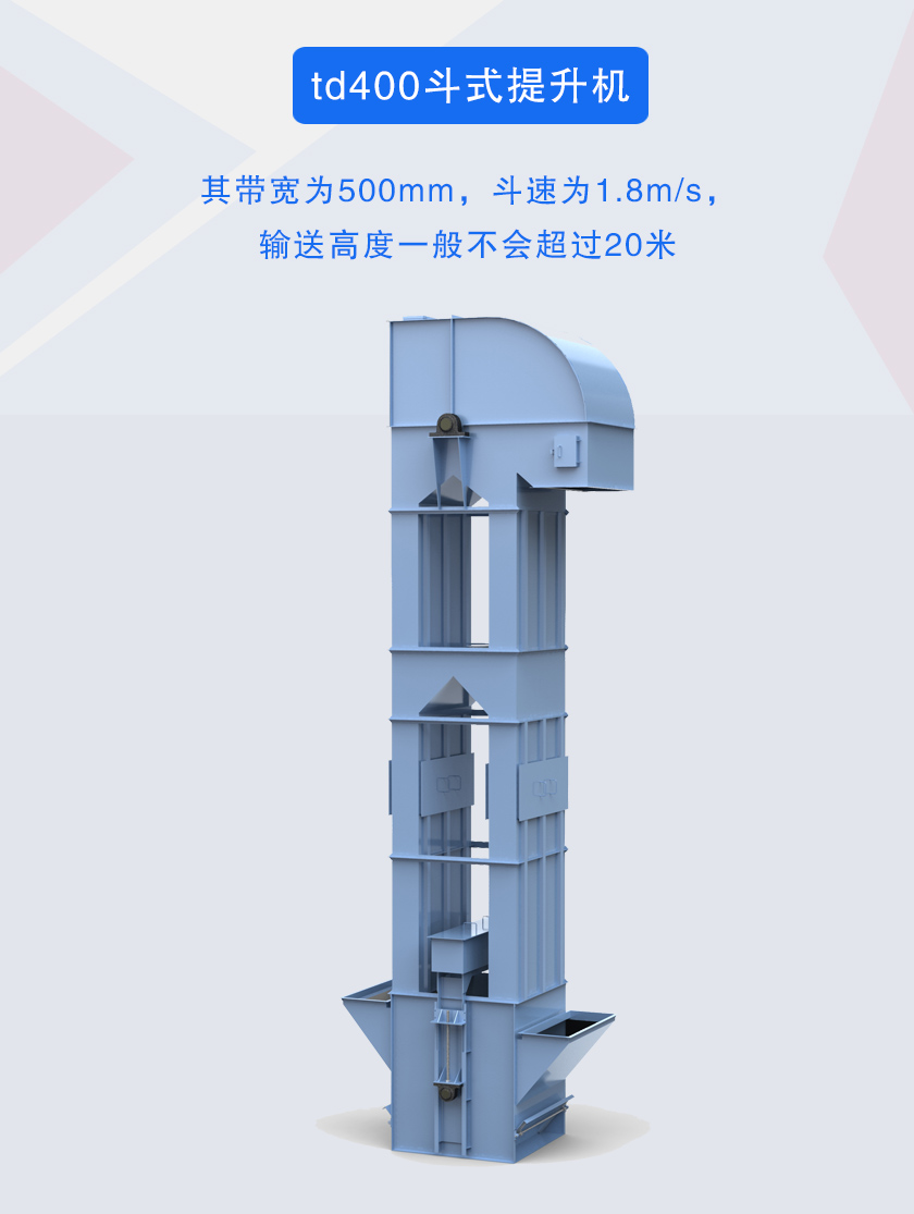 td400斗式提升機(jī)牽引件為橡膠帶,斗寬為400mm,帶寬為500mm,斗速為1.8m/s,提升高度達(dá)80米.提升量每小時(shí)可達(dá)24-66立方,可根據(jù)用戶(hù)要求選擇碳鋼和不銹鋼材質(zhì).