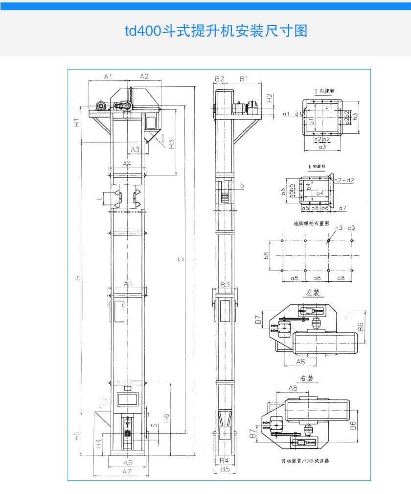td400斗式提升機(jī)由運(yùn)行部分(料斗與牽引膠帶),帶有傳動(dòng)滾筒的上部區(qū)段,帶有拉緊滾筒的下部區(qū)段,中間機(jī)殼,驅(qū)動(dòng)裝置,逆止制動(dòng)裝置等組成,傳動(dòng)裝置有兩種形式,分別配有YZ型減速器、ZQ(或YY)型減速器,YZ型軸減速器直接是安裝在主軸軸頭上,省去了提升機(jī)傳動(dòng)平臺(tái)、聯(lián)軸器等,結(jié)構(gòu)更為緊湊,重量輕,內(nèi)部安裝有異型逆止器,逆止可靠。