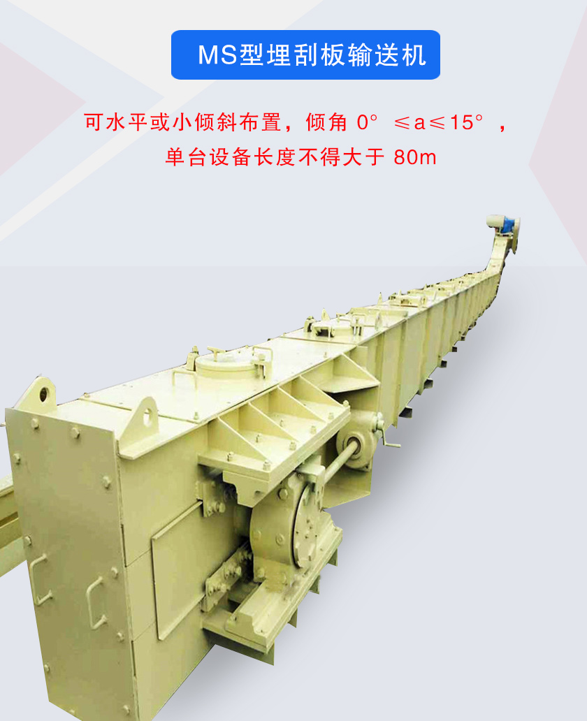 2、MS型埋刮板輸送機:可水平或小傾斜布置,傾角 0°≤a≤15°,單臺設備長度不得大于 80m。