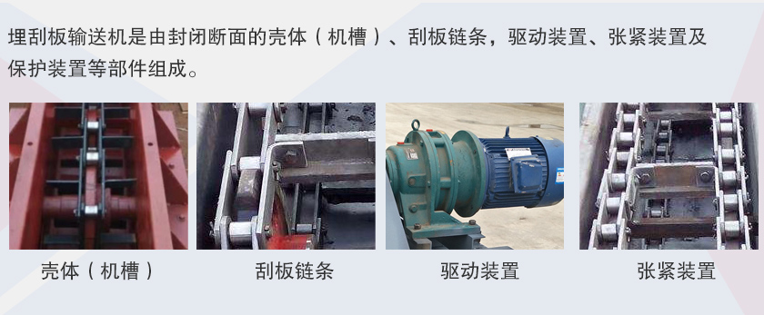 埋刮板輸送機是由封閉斷面的殼體(機槽)、刮板鏈條,驅動裝置、張緊裝置及保護裝置等部件組成。