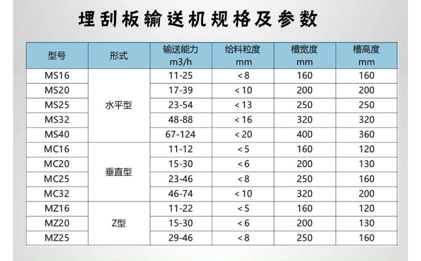 3、MC型埋刮板輸送機:可以垂直或大傾斜布置,傾角 45°≤a≤90°,單臺設備的輸送高度不大于30m。