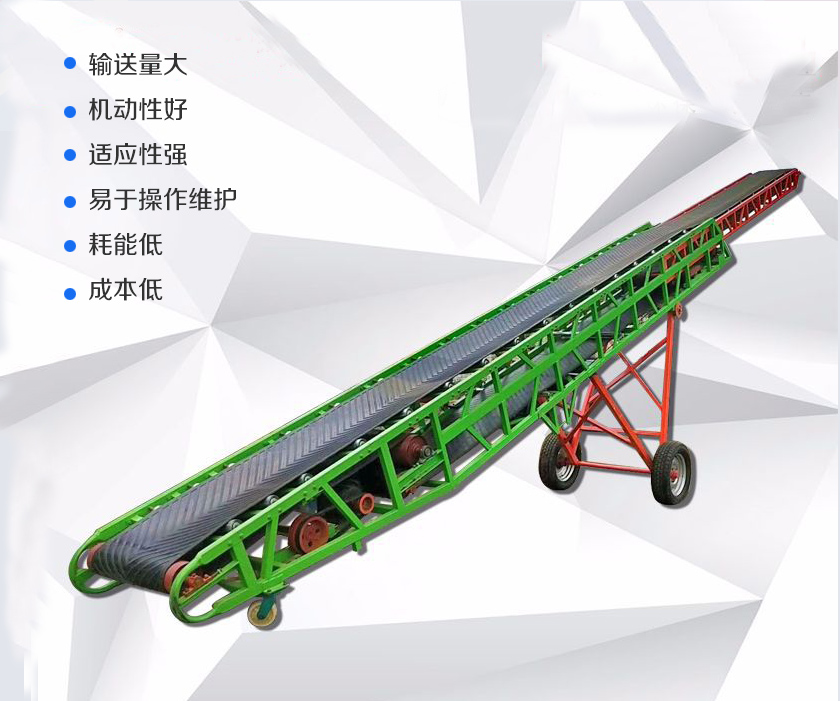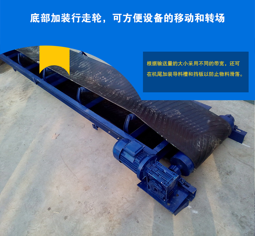 移動(dòng)式皮帶輸送機(jī)是底部加裝了行走輪,移動(dòng)方便,可根據(jù)現(xiàn)場向下輸送物料,也可用戶傾斜輸送,移動(dòng)式皮帶輸送機(jī)可加裝擋料板來防止物料滑落.