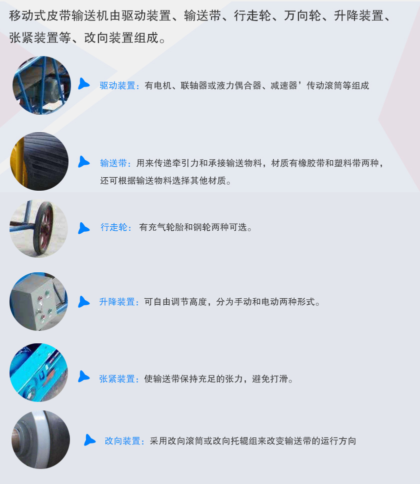 移動(dòng)式皮帶輸送機(jī)由驅(qū)動(dòng)裝置、輸送帶、行走輪、萬向輪、升降裝置、張緊裝置等、改向裝置組成。