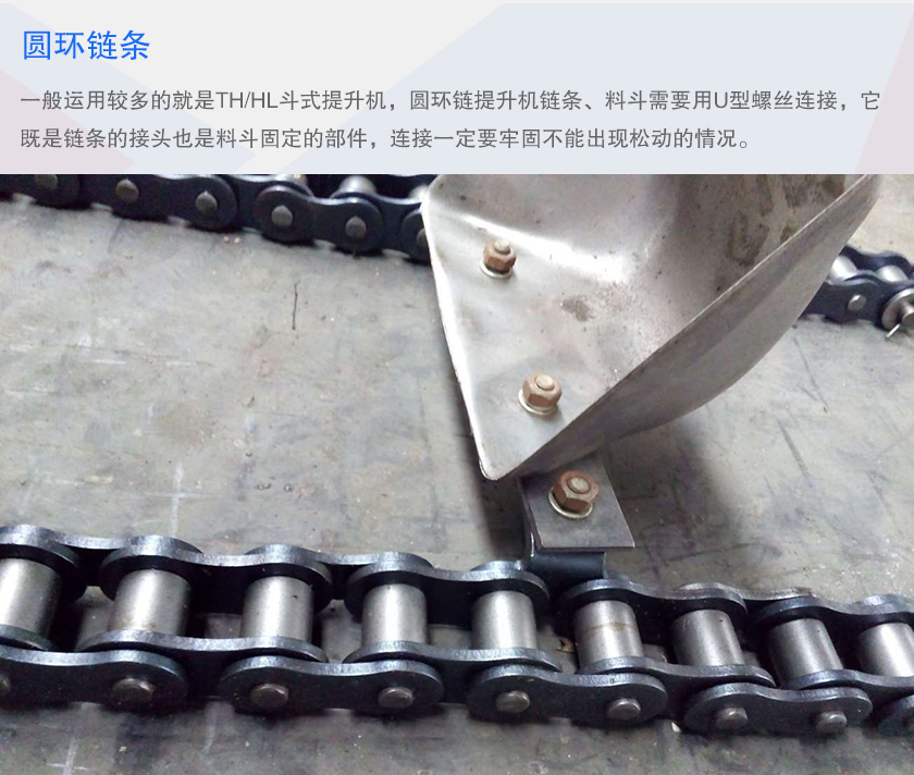 圓環(huán)鏈條:一般運(yùn)用較多的就是TH/HL斗式提升機(jī),圓環(huán)鏈提升機(jī)鏈條、料斗需要用U型螺絲連接,它既是鏈條的接頭也是料斗固定的部件,連接一定要牢固不能出現(xiàn)松動(dòng)的情況。