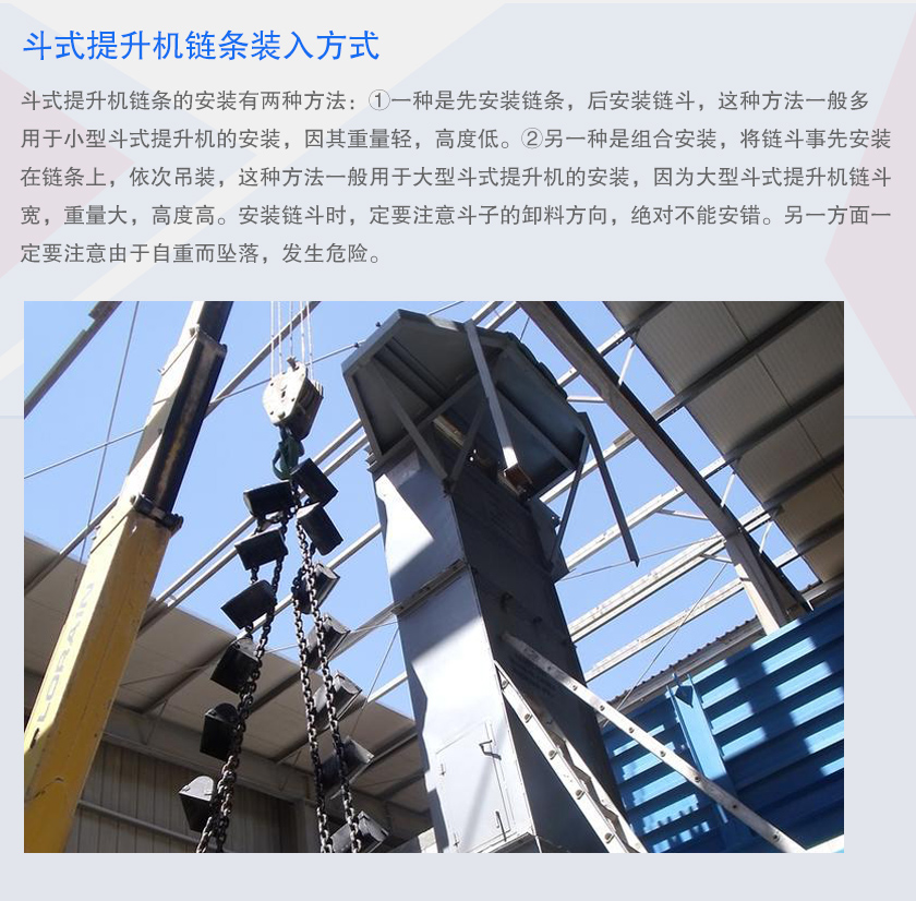 斗式提升機(jī)鏈條的安裝有兩種方法:①一種是先安裝鏈條,后安裝鏈斗,這種方法一般多用于小型斗式提升機(jī)的安裝,因其重量輕,高度低。②另一種是組合安裝,將鏈斗事先安裝在鏈條上,依次吊裝,這種方法一般用于大型斗式提升機(jī)的安裝,因?yàn)榇笮投肥教嵘龣C(jī)鏈斗寬,重量大,高度高。安裝鏈斗時(shí),定要注意斗子的卸料方向,不能安錯(cuò)。另一方面一定要注意由于自重而墜落,發(fā)生危險(xiǎn)。