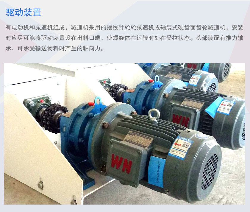 驅(qū)動(dòng)裝置:有電動(dòng)機(jī)和減速機(jī)組成,減速機(jī)采用的擺線針輪輪減速機(jī)或軸裝式硬齒面齒輪減速機(jī),安裝時(shí)應(yīng)盡可能將驅(qū)動(dòng)裝置設(shè)在出料口端,使螺旋體在運(yùn)轉(zhuǎn)時(shí)處在受拉狀態(tài)。頭部裝配有推力軸承,可承受輸送物料時(shí)產(chǎn)生的軸向力。