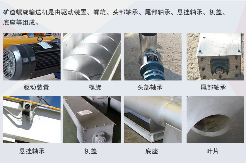 礦渣螺旋輸送機是由驅(qū)動裝置、螺旋、頭部軸承、尾部軸承、懸掛軸承、機蓋、底座等組成。驅(qū)動裝置:由電動機、減速器、聯(lián)軸器等組成。螺旋軸與吊軸承、頭部軸承、尾部軸承聯(lián)接采用嵌入舌式,安裝拆卸不需軸向移動,維修方便,采用變徑結(jié)構(gòu),增大吊軸承處的容積,避免吊軸承與物料接觸,各傳動部位采用浮動聯(lián)接方式,頭尾軸承座均在殼體外,所有軸承采用多層密封和配合密封技術(shù),軸承使用壽命長。