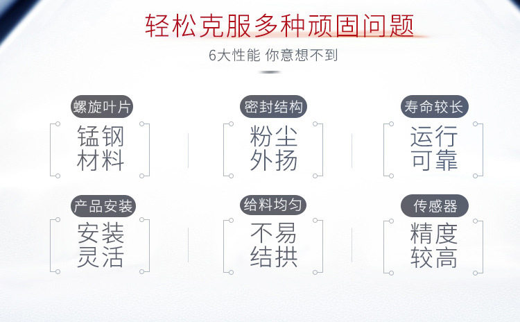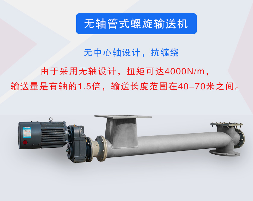 3、由于采用無(wú)軸設(shè)計(jì),扭矩可達(dá)4000N/m,輸送量是有軸的1.5倍,輸送長(zhǎng)度范圍在40-70米之間。