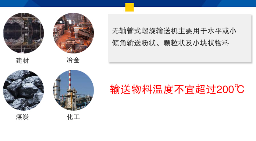 無(wú)軸管式螺旋輸送機(jī)主要用于水平或小傾角輸送粉狀、顆粒狀及小塊狀物料,輸送物料溫度不宜超過(guò)200℃,廣泛應(yīng)用于建材、冶金、煤炭、化工、污水處理、輕工業(yè)等行業(yè)。