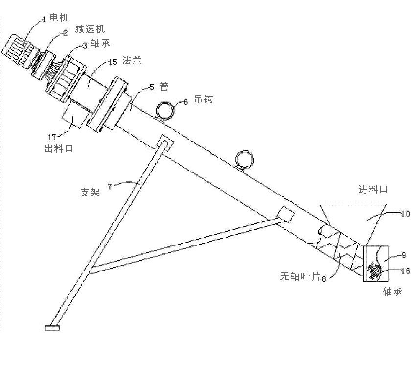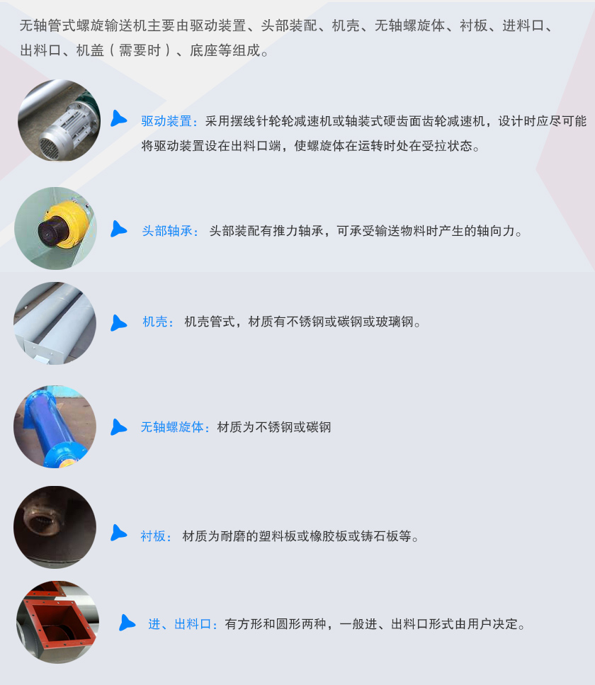 無(wú)軸管式螺旋輸送機(jī)主要由驅(qū)動(dòng)裝置、頭部裝配、機(jī)殼、無(wú)軸螺旋體、襯板、進(jìn)料口、出料口、機(jī)蓋(需要時(shí))、底座等組成。