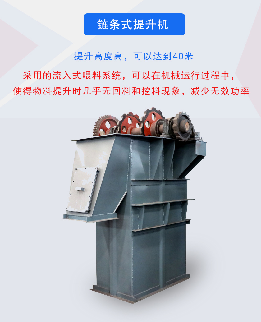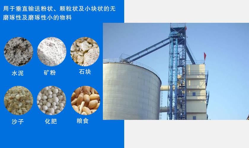鏈?zhǔn)教嵘龣C(jī)可用于垂直輸送粉狀、顆粒狀及小塊狀的無磨琢性及磨琢性小的物料,如水泥、礦粉、石塊、沙子、化肥、糧食等。