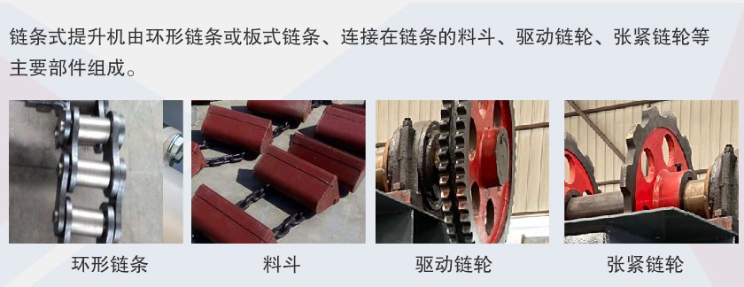 鏈條式提升機(jī)采用的是鏈條作為牽引構(gòu)件,一般安裝的是兩條平行的傳動鏈,上或下面有一對傳動鏈輪,下或上面是一對改向鏈輪。
