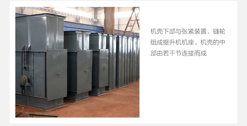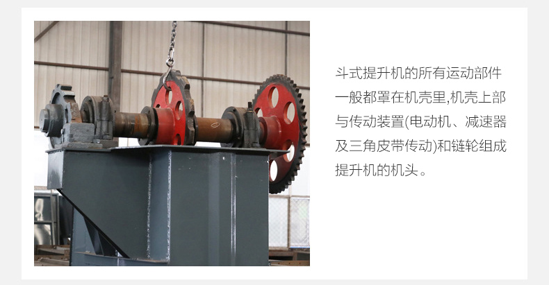 鏈條式提升機(jī)由環(huán)形鏈條或板式鏈條、連接在鏈條的料斗、驅(qū)動鏈輪、張緊鏈輪等主要部件組成。斗式提升機(jī)的所有運(yùn)動部件一般都罩在機(jī)殼里,機(jī)殼上部與傳動裝置(電動機(jī)、減速器及三角皮帶傳動)和鏈輪組成提升機(jī)的機(jī)頭。機(jī)殼下部與張緊裝置、鏈輪組成提升機(jī)機(jī)座。機(jī)殼的中部由若干節(jié)連接而成。