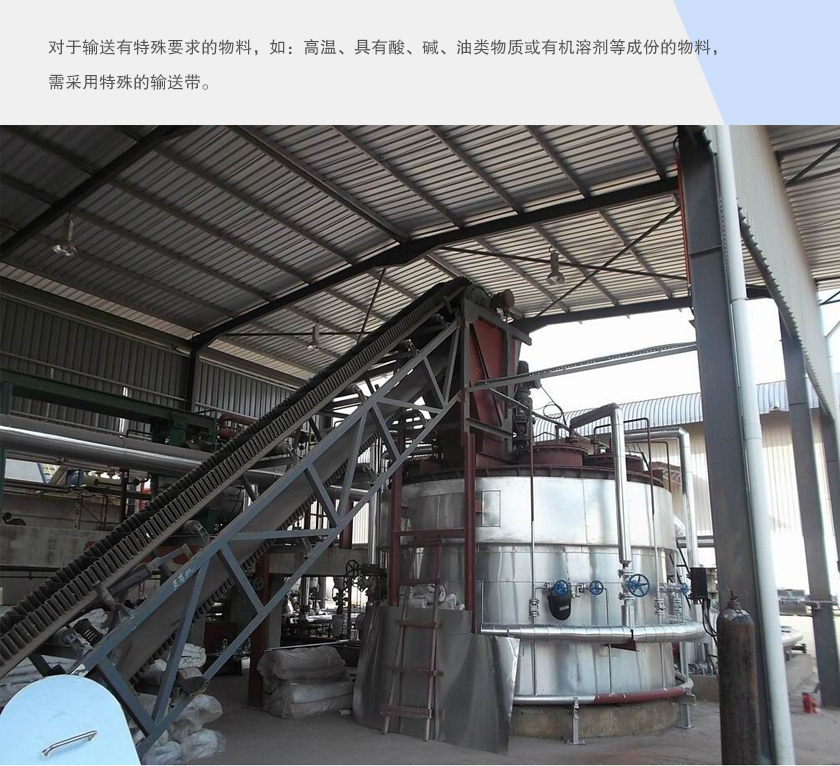 3、對(duì)于輸送有特殊要求的物料,如:高溫、具有酸、堿、油類物質(zhì)或有機(jī)溶劑等成份的物料,需采用特殊的輸送帶。