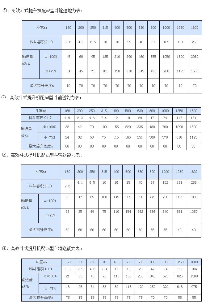 配置不同的料斗,其輸送能力不同,故將高效斗式提升機(jī)技術(shù)參數(shù)表列為四種: