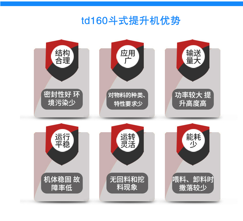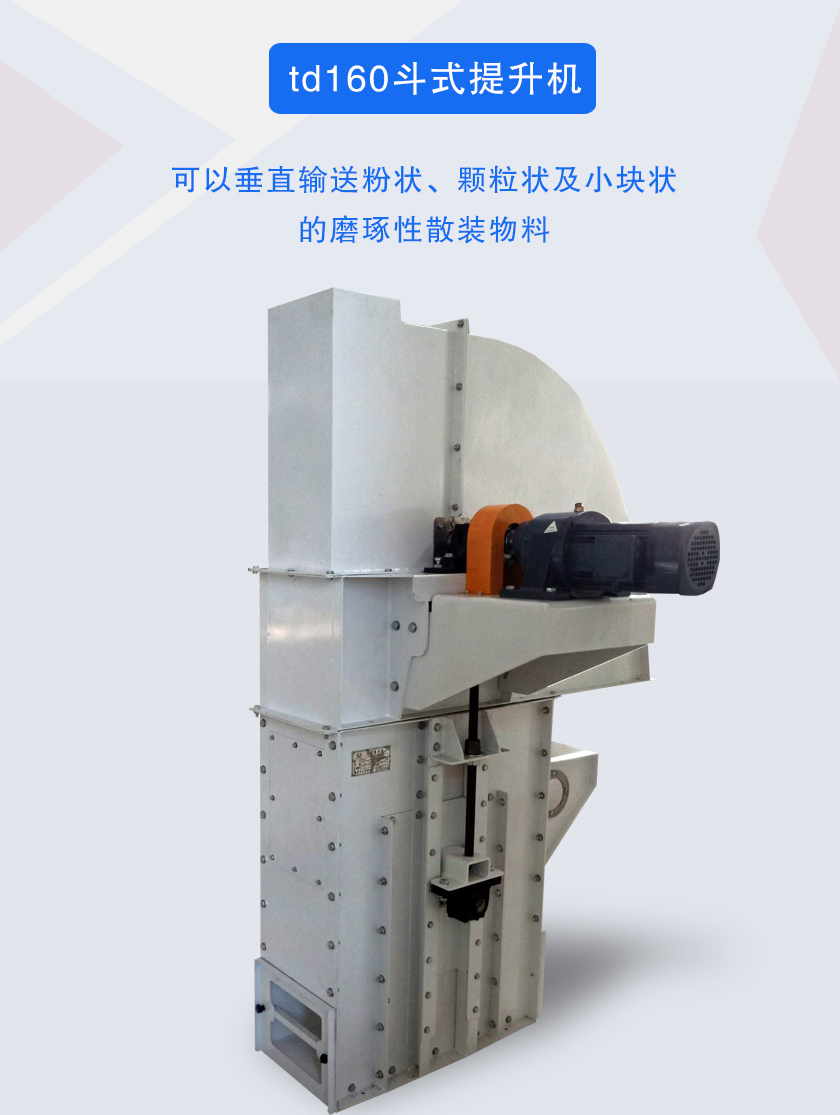td160斗式提升機(jī)斗寬為160mm,垂直輸送粉狀、顆粒狀及小塊狀的磨琢性散裝物料,每小時(shí)輸送量可達(dá)5.4-16立方,可根據(jù)物料性質(zhì)選擇碳鋼或不銹鋼材質(zhì).