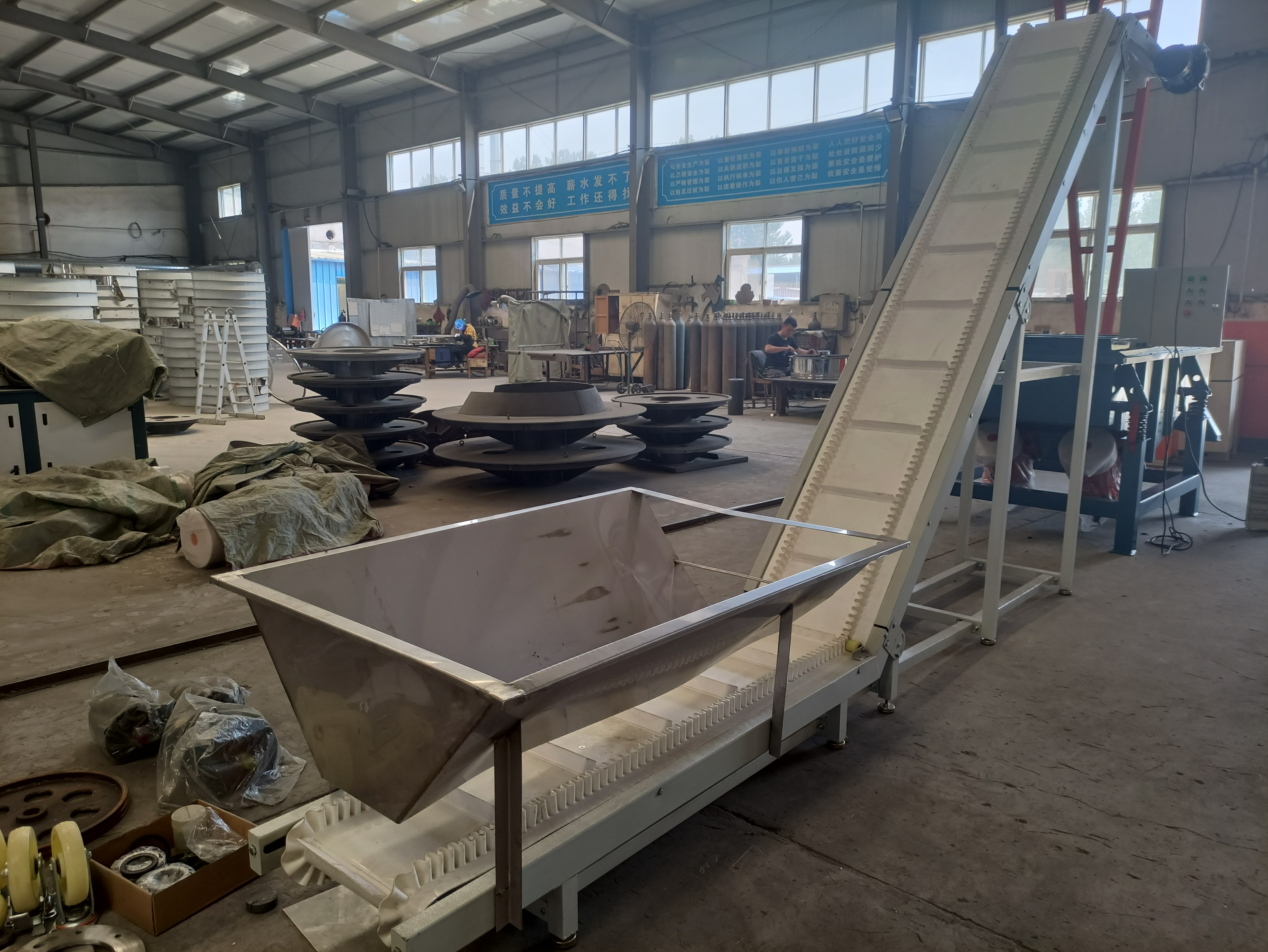 爬坡皮帶輸送機(jī)的爬坡角度可以大于30度,垂直輸送甚至可以達(dá)到90度,適用于在樓層或高處之間連續(xù)輸送貨物。