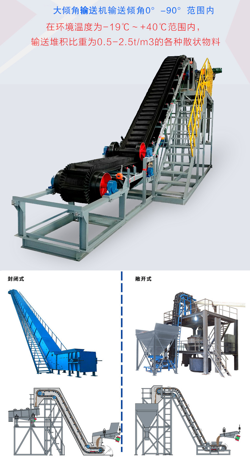 1、可大傾角輸送散狀物料,可節(jié)省大量設(shè)備占地面積,徹底解決普通皮帶輸送機(jī)無(wú)法達(dá)到的輸送角度,可以30度-90度范圍內(nèi)輸送。