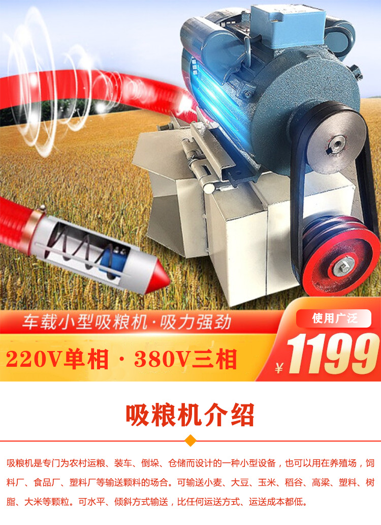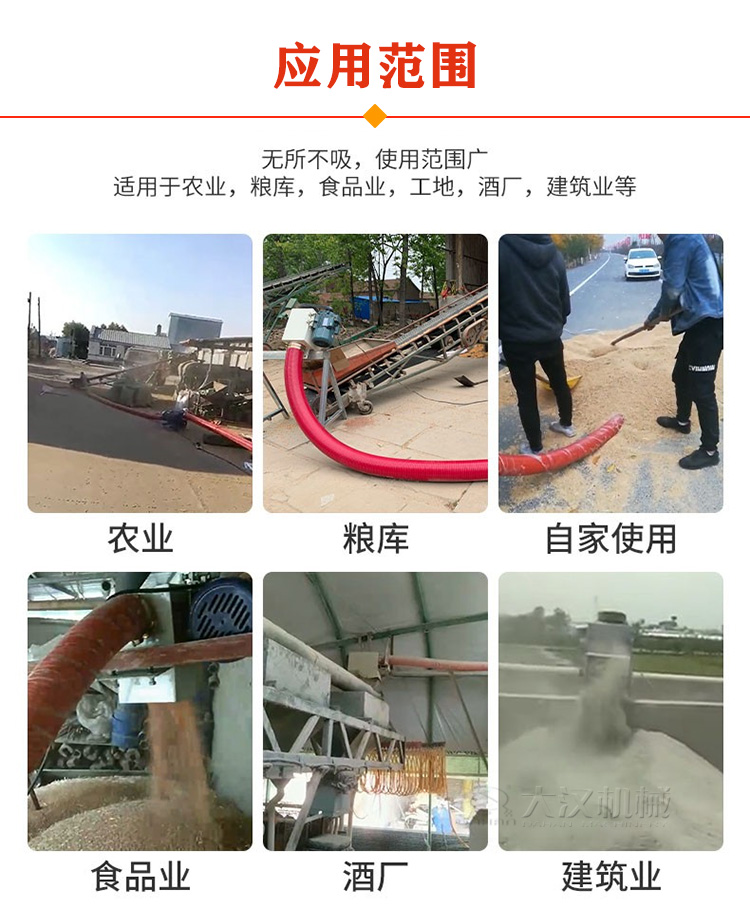 吸糧機(jī)是農(nóng)場吸糧、抽糧的好幫手,適合糧食運輸、裝載、堆垛、儲存等,長度3-30米,每小時可輸送20噸糧食,它可以水平、傾斜或垂直輸送谷物。糧食垂直輸送時,每小時輸送量可達(dá)6噸。