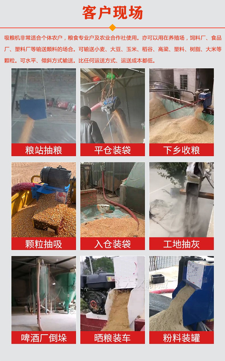 吸糧機(jī)可水平、斜向、垂直輸送物料,單機(jī)獨立完成輸送任務(wù)。