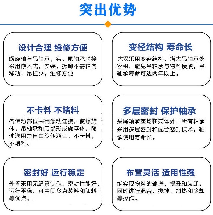以上是對螺旋輸送機的介紹,產(chǎn)品規(guī)格有(管型、U型)(單軸、無軸),外殼葉片材質(zhì):碳鋼、不銹鋼,根據(jù)被輸送物料的粒度、輸送量和輸送距離,合理選擇和設(shè)計,做到不堵塞、不起拱、出料順暢。