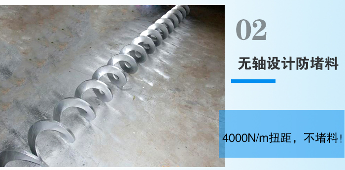 無(wú)軸螺旋輸送機(jī)其扭距可達(dá)4000N/m,所以物料不易堵塞,排料口也出現(xiàn)不堵塞,因而可以降低螺旋機(jī)的運(yùn)轉(zhuǎn)速度使其平穩(wěn)傳動(dòng),從而達(dá)到降低能耗的效果。無(wú)軸螺旋輸送機(jī)輸送量大,輸送量是相同直徑傳統(tǒng)有軸螺旋輸送機(jī)的1.5倍。