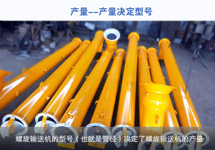 螺旋輸送機的型號(也就是管徑)決定了螺旋輸送機的產(chǎn)量,輸送產(chǎn)量越大,螺旋輸送機選擇的型號越就餓越大。