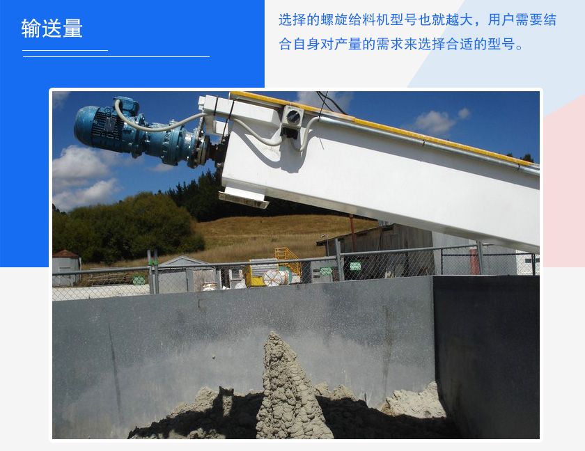 輸送量大小將直接決定設(shè)備型號大小的選擇,用戶所需產(chǎn)量越大,選擇的螺旋給料機(jī)型號也就越大,用戶需要結(jié)合自身對產(chǎn)量的需求來選擇合適的型號。