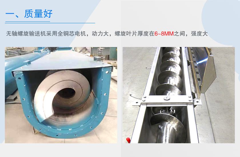無(wú)軸螺旋輸送機(jī)采用全銅芯電機(jī),動(dòng)力大,螺旋葉片厚度在6~8mm之間,強(qiáng)度大,在輸送物料時(shí)極少出現(xiàn)葉片磨損或斷裂現(xiàn)象,減速機(jī)軸承有良好的潤(rùn)滑,其工作壽命不低于100000小時(shí),停機(jī)時(shí)間少,減少維護(hù)成本。另外,大漢廠家生產(chǎn)的無(wú)軸螺旋輸送機(jī)在生產(chǎn)過(guò)程中有多項(xiàng)質(zhì)量檢測(cè)標(biāo)準(zhǔn),保證不合格不出廠,設(shè)備在售出后30天質(zhì)量問(wèn)題支持免費(fèi)退換,質(zhì)保為1年。