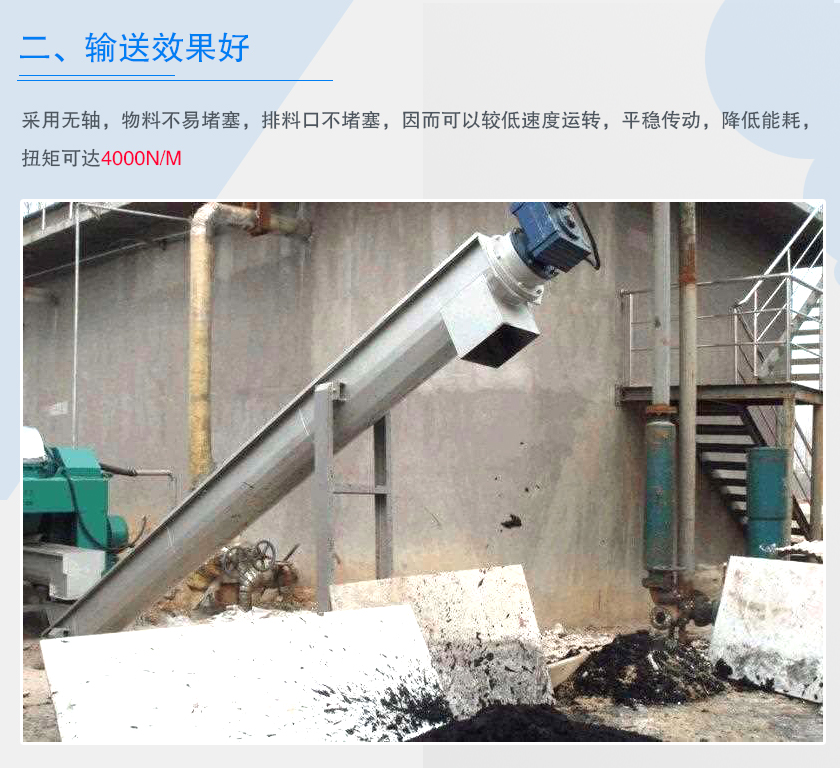 無(wú)軸螺旋輸送機(jī)由于采用無(wú)軸,物料不易堵塞,排料口不堵塞,因而可以較低速度運(yùn)轉(zhuǎn),平穩(wěn)傳動(dòng),降低能耗,扭矩可達(dá)4000N/m,輸送量是相同直徑傳統(tǒng)有軸螺旋輸送機(jī)的1.5倍,單機(jī)輸送長(zhǎng)度可達(dá)60米。并可根據(jù)用戶需要,采用多級(jí)串聯(lián)式安裝。