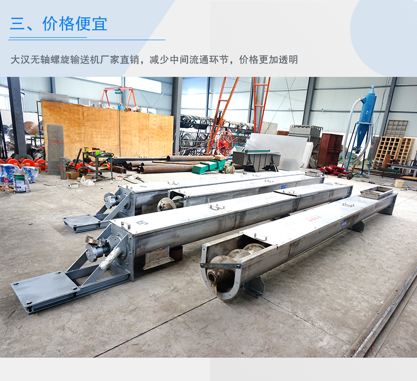 大漢無(wú)軸螺旋輸送機(jī)廠家直銷,減少中間流通環(huán)節(jié),價(jià)格更加透明,廠家位于河南省新鄉(xiāng)市,生產(chǎn)成本較北京、上海等地會(huì)更加便宜,所以無(wú)軸螺旋輸送機(jī)價(jià)格也會(huì)更低。