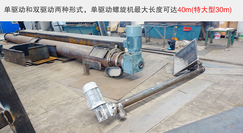 管式螺旋輸送機(jī)分為單驅(qū)動和雙驅(qū)動兩種形式,單驅(qū)動螺旋機(jī)長度可達(dá)40m(特大型30m),雙驅(qū)動螺旋機(jī)采用中間斷開軸結(jié)構(gòu),長度可達(dá)80m(特大型60m),螺旋機(jī)長度每 0.5m 一檔,可根據(jù)需要選定。