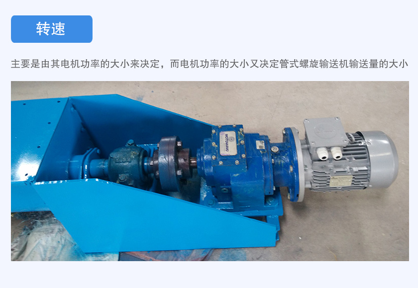 管式螺旋輸送機(jī)轉(zhuǎn)速主要是由其電機(jī)功率的大小來決定,而電機(jī)功率的大小又決定管式螺旋輸送機(jī)輸送量的大小,如果電機(jī)功率過小,會導(dǎo)致物料在管內(nèi)的運行速度變慢,減低輸送效率,嚴(yán)重情況下還會導(dǎo)致電機(jī)燒毀。如果電機(jī)功率過大,會耗電量上升,增加企業(yè)運行成本。