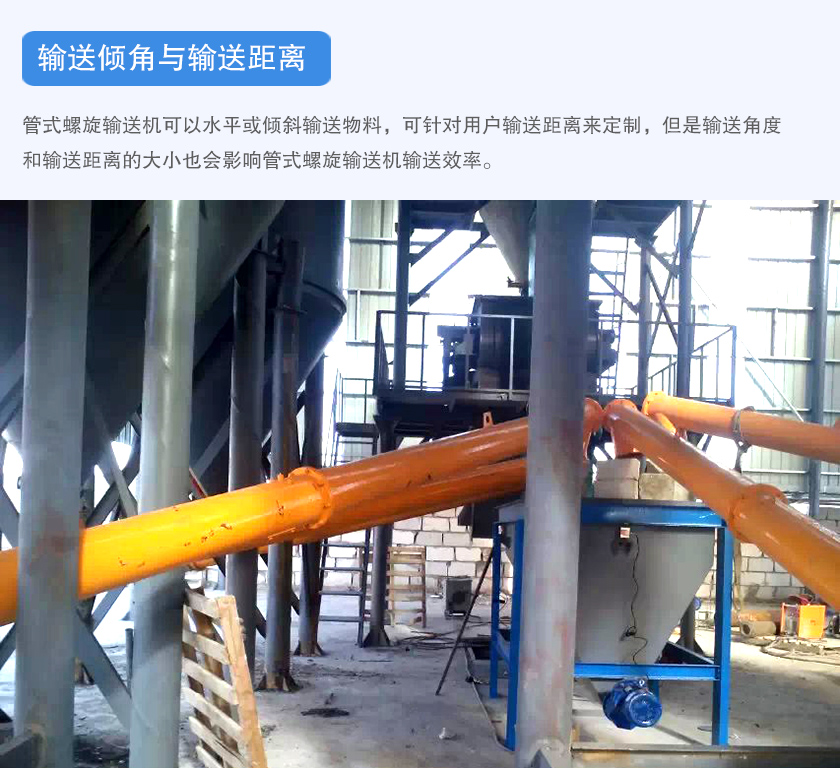 管式螺旋輸送機(jī)可以水平或傾斜輸送物料,可針對用戶輸送距離來定制,但是輸送角度和輸送距離的大小也會影響管式螺旋輸送機(jī)輸送效率。