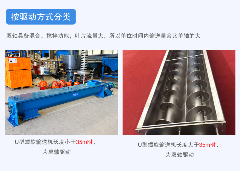 1、U型螺旋輸送機(jī)長(zhǎng)度小于35m時(shí),為單軸驅(qū)動(dòng)。